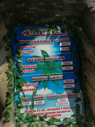 Выражаю благодарность Виктории, которая с нами кормила крокодилов, она много знает про каждого из них и к каждому находит свой подход, живет их жизнью вместе с ними, мы уже ездим 6 лет подряд и всегда приходим к ней, человек знает свое дело, чистота везде у крукодилов и крокодилы видно ее слушаются, видимо уже приняли за свою), рекомендуем сходить к Виктории в крокодиллаую ферму.